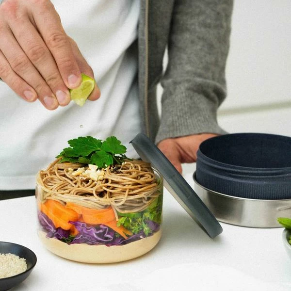 Black & Blum’s new leakproof and lightweight glass lunch box is finished in a slate tone. The silicone lid prevents splattering when microwaving and the base container is made from durable polypropylene combined with sustainably-sourced wood fiber which provides protection for the glass bowl and makes it easy to hold after microwaving. The stainless-steel lid screws onto the base to provide a leak-proof seal. -100% leakproof -Microwave safe, including wood fibre base for easy handling when hot (*not Stainless steel lid) Oven safe glass and silicone lid (*not wood fiber base) Dishwasher safe Freezer safe BPA free 5.51in x 5.51in x 3.15in/25 floz