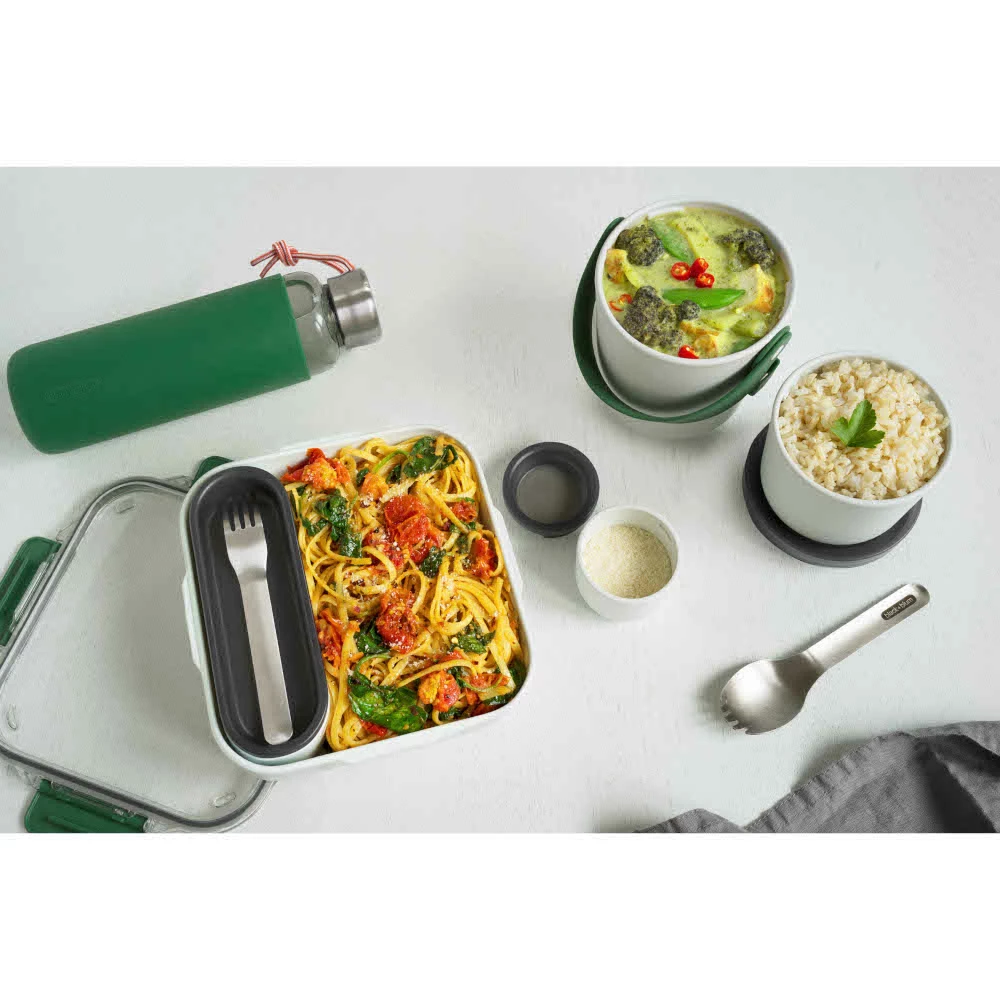 It includes a removable, and lidded, leak-proof inner container as well as a neat round leak-proof sauce pot with a garnish area in the lid, plus a high quality stainless-steel fork. 4 tabs, one on each side, ensure secure and leakproof sealing so that you dont need to worry about anything escaping whilst the box is bouncing around in your bag! Special
