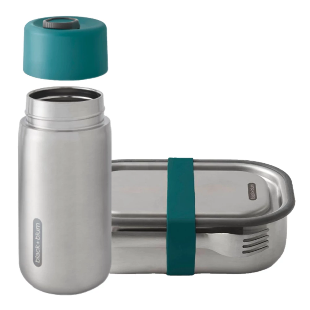 Black-Blum Lunch Box & Travel Cup Set in Stainless Steel with Silicone Strap – OceanWe have combined the first ever truly 100% leakproof stainless steel lunch box with Black+Blums new 100% leakproof stainless steel travel cup. A great gift for anyone who is on the go, whether going to work, travelling, walking, camping or just enjoying the outdoors.The 3 in 1, multi-functional lunch box allows you not only to transport your breakfast, lunch or dinner meal anywhere you go but to also cook dishes in the oven and even store pre-cooked meals in a freezer. Its just so versatile and amazing! The silicone valve creates a secure vacuum sealed closure, the slider divider allows you to separate the contents with ease, and the fork + holder are added for convenience. A beautifully thought out winner providing the best meals on the hoof!The travel cup will keep your drinks nice and hot for up to 5 hours at a time and is a total pleasure to drink from especially as it offers simple, safe and secure one handed opening and closing. The top is absolutely 100% leakproof, one hand lockable and extremely easy to disassemble enabling you to clean it thoroughly keeping it germ free. This is a no-nonsense, built-to-last, designed to function travel cup that will last you a lifetime.Special Features…Lunch Box & Travel Cup Completely 100% leakproofLunch Box Totally Plastic FreeLunch Box Vacuum Sealed Closing MechanismLunch Box Oven & Freezer SafeLunch Box & Travel Cup High Quality Stainless SteelLunch Box Complete with Fork & Internal DividerTravel Cup 5 hours hot, 8 hours coldTravel Cup One Handed Opening & ClosingTravel Cup Securely LockableTravel Cup Fits Most Bike Bottle Cages & Car Cup Holders (Dia 7.2cm) Lunch Box L20xW15xH6.5cms & Travel Cup L7.2xW7.2xH16.5cms