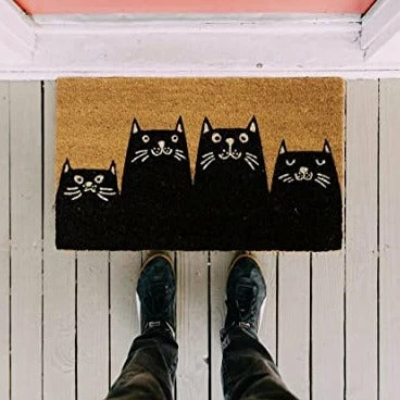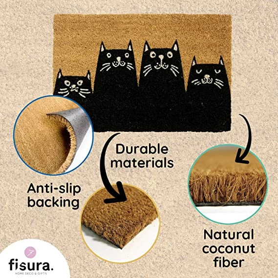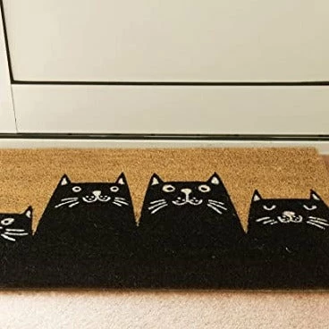 Announce yourself as a cat-lover from the minute your guest steps through the door! This super-cute doormat features an adorable cat design and is crafted from durable materials. Created in a no-waste process from 100% natural coconut fibre, it also features a black non-slip PVC base. The mat is thick and luscious, meaning that it will stand the test of time. Wipe your paws without worrying about wearing it down! Description Height 40cm, Width 60cm, DEpth 1.5. cm. Material: coconut fibre, PVC.