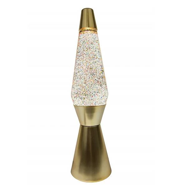 Description 10.5 cm x 40 cm. Bottle: 22 cm. Cable 160 cm. Material Aluminium, plastic, fluid, glass. Mat gold base, clear liquid, multicolour glitter. Electroplated, brushed gold-coloured base and cap. Bulb included. Switch type In line. If a bulb burns out, the lamp box contains a spare one to solve the situation. Do not touch any part of the lava lamp while it is on or just off. The lamp takes very high temperatures to be able to work.We recommend other lava lamps be placed well out of reach of children under 14. Disconnect from electric current and clean with wet cloth.