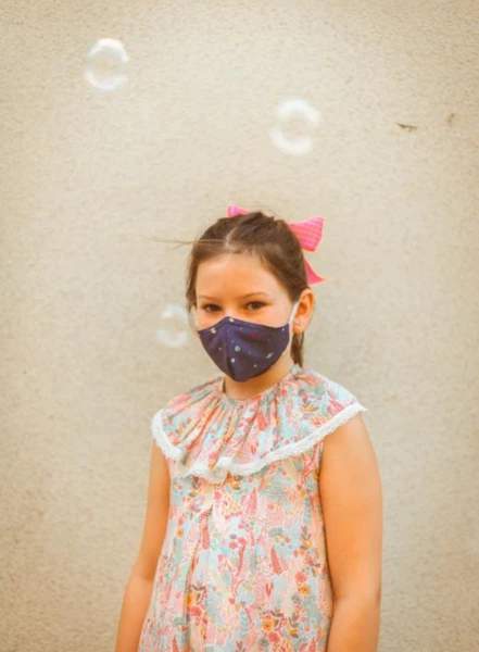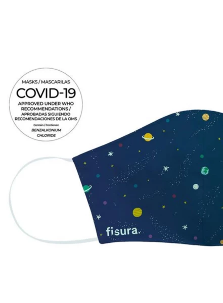 Kids face mask in navy with a galaxy print, suitable for ages 6 to 11 years old. All face masks are produced using the best materials and fabrics, taking into account the recommendations of the World Health Organization. Their vast know-how has allowed Fisura to develop a solution that combines comfort with safety, protection and design.Three layers protection face mask:Outer layer with repellent finishing to make virus penetration difficult.Intermediate layer composed of an interlining that maintains an armed canopy to keep the mask shape for a better breathing.Interior layer with a repellent finish plus an antibacterial treatment to avoid virus hosting and proliferation. Non Surgical, non certified.