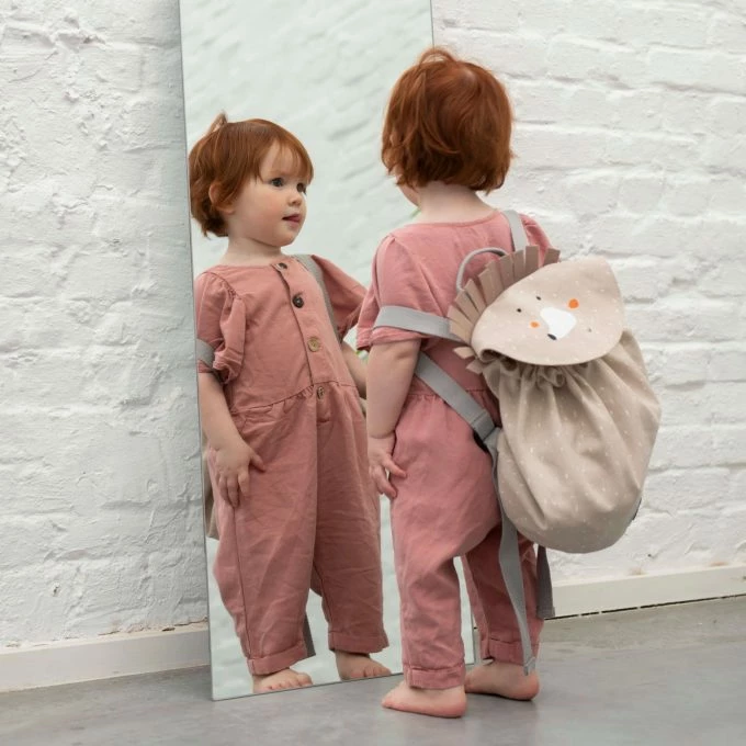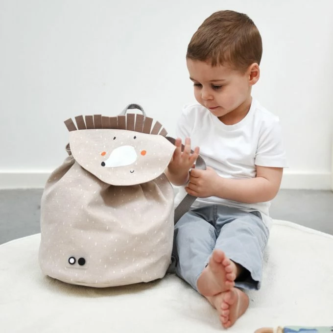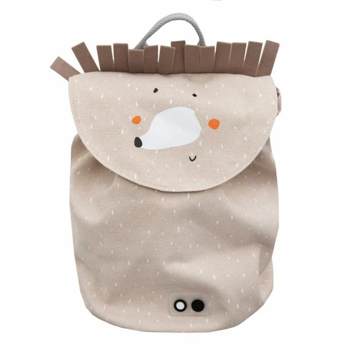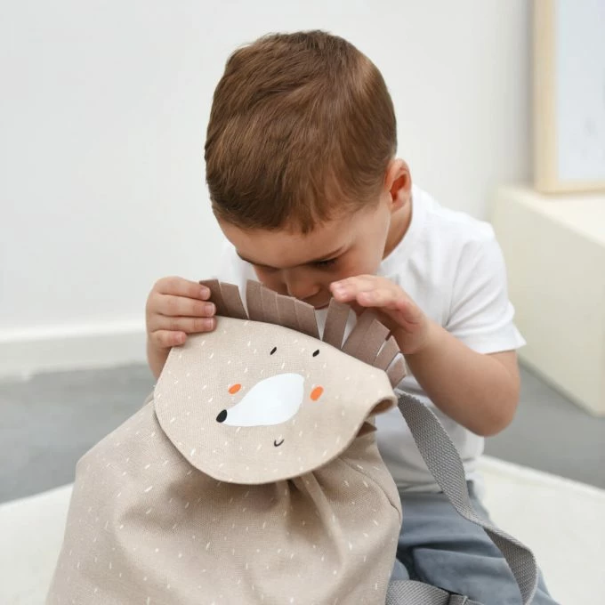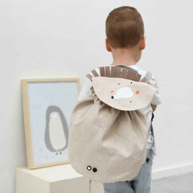 A nice Hedgehog backpack in the shape of a sack to take to kindergarten, school or on an excursion. It is water repellent, opens and closes with a cord and has a magnetic clip, the straps are adjustable but are not padded. It is cute!