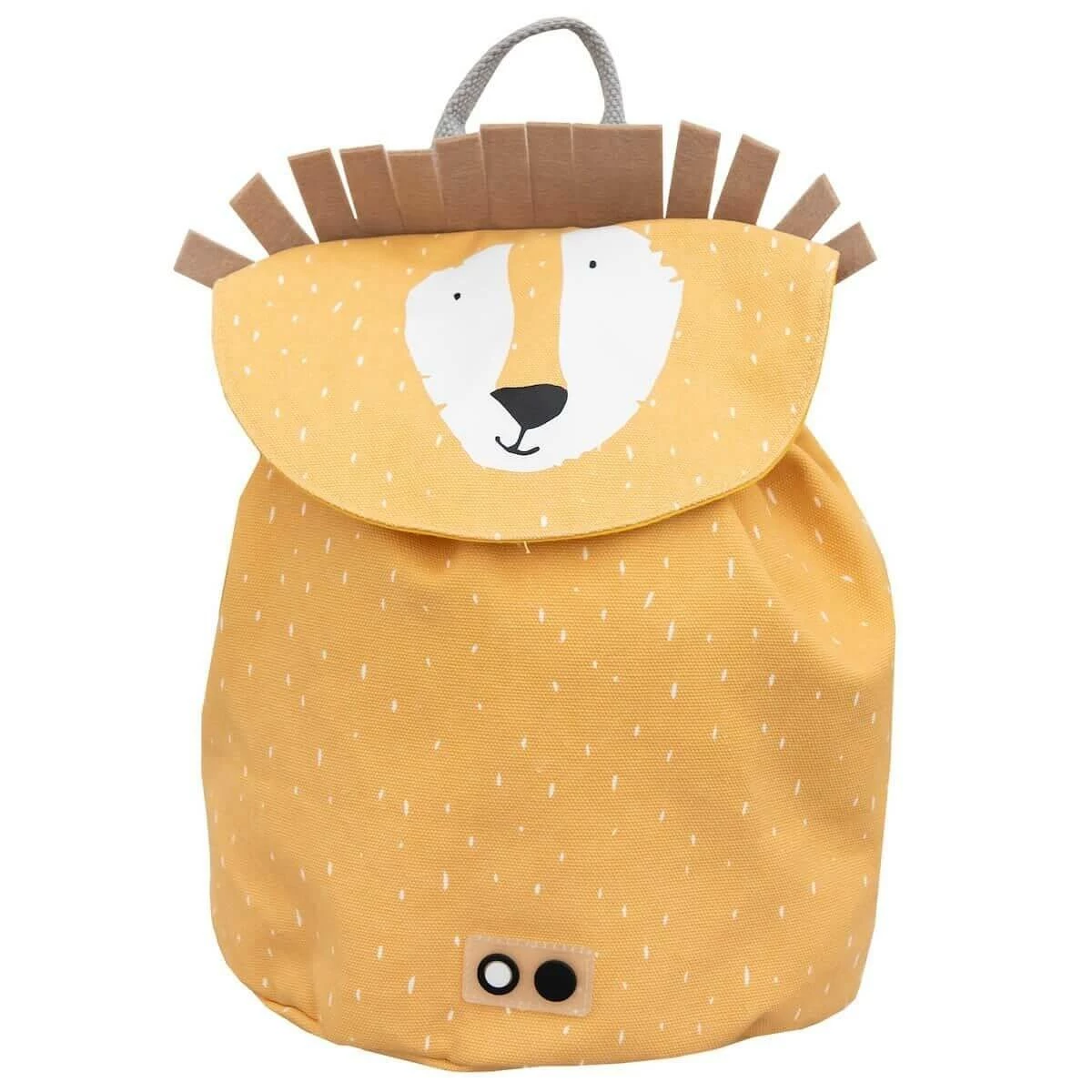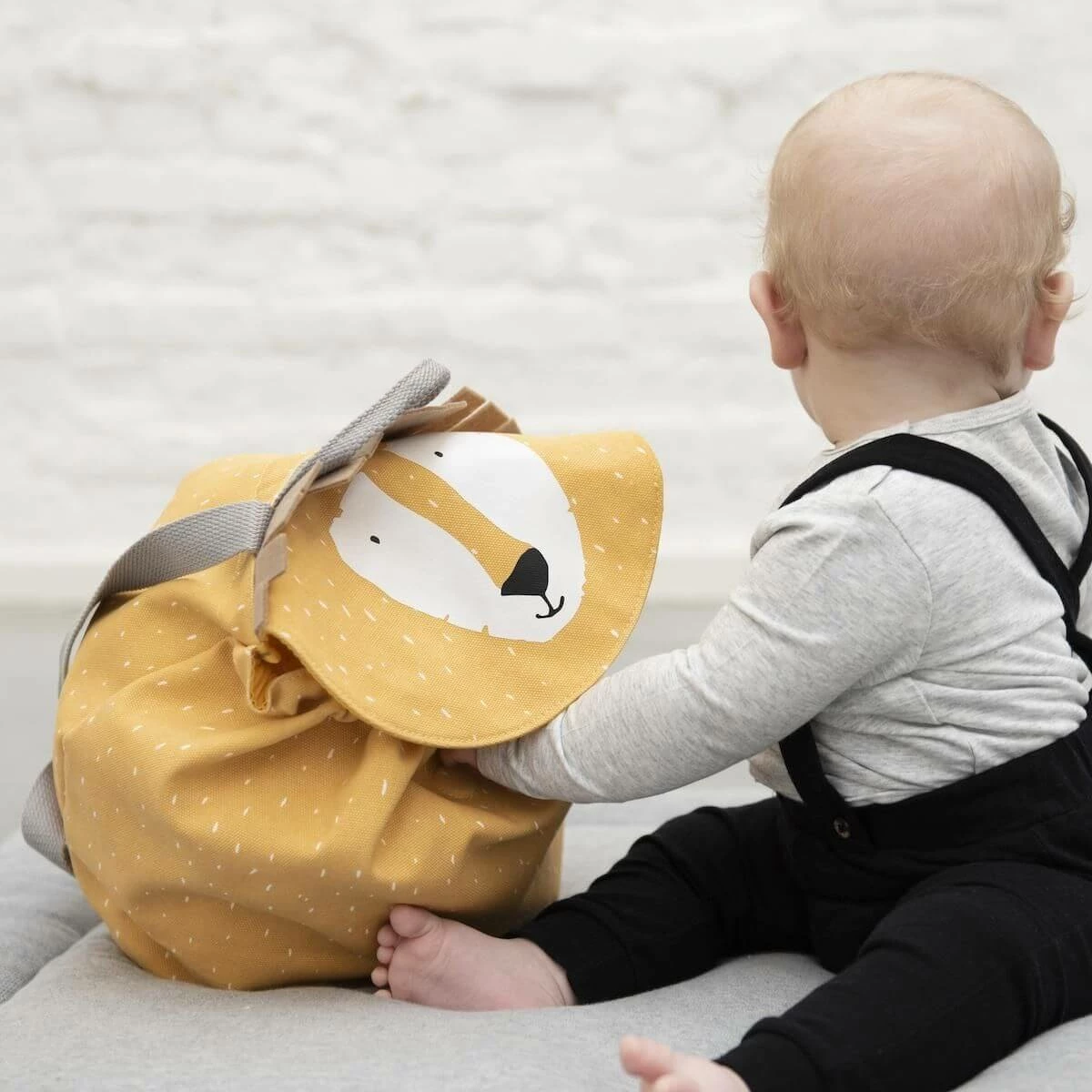 Una simpática mochila de León en forma de saco para llevar a la guardería, al cole o de excursión. Es repelente al agua, se abre y cierra con un cordón y lleva un clip imantado, los tirantes son ajustables pero no están acolchados. ¡Es una monada!