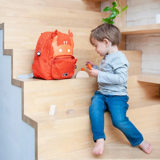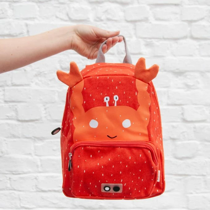 A fun Crab backpack to go to kindergarten, school or on a field trip. It is water repellent, has a name tag, adjustable padded straps, a small front zippered pocket and a top handle for convenient hanging. He will love it!