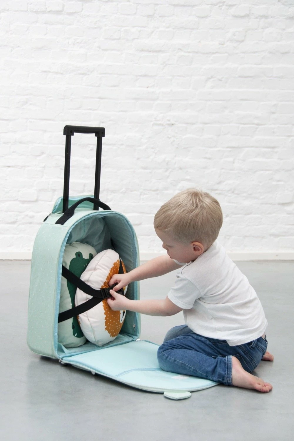 Trolley per Bambini Come i grandi, anche i bambini hanno la loro valigia! Un comodo trolley, con maniglia, maniglia estraibile per il traino cerniera che apre completamente la struttura, tasta frontale anch’essa con cerniera. E la si può portare in cabina. E a renderla simpatica, le applicazioni in feltro per la criniera del leone. Dettagli: esterno: 100% cotone resistente all’acqua fodera: 90% poliestere e 10% cotone Dimensioni (cm): 45 x 34 x 15